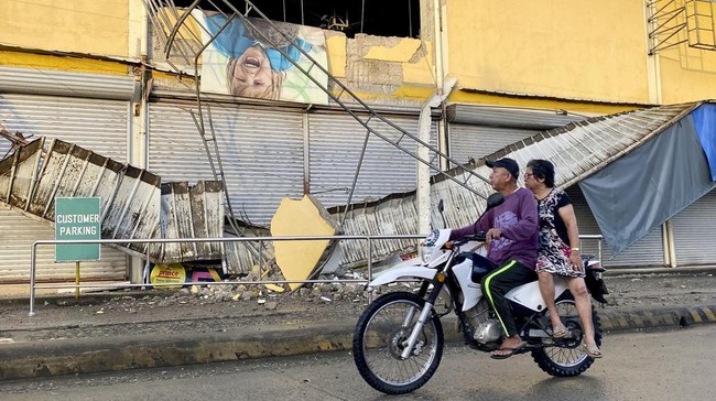 Sebuah sepeda motor melewati toko kelontong yang rusak sebagian akibat gempa di Kota Bayugan, Agusan del Sur, Filipina selatan, Minggu pagi, 3 Desember 2023.