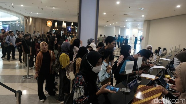 Penonton melakukan registrasi sebelum memasuki hall acara #DemiIndonesia Cerdas Memilih di The Kasablanka Hall, Kota Kasablanka, Jakarta Selatan, Kamis (7/12/2023).