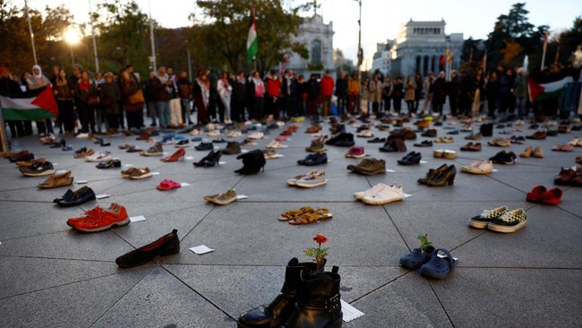madrid - Ratusan sepatu berjejer di halaman Balai Kota Madrid, Spanyol. Aksi ini sebagai bentuk dukungan untuk warga Palestina yang jadi korban serangan Israel.