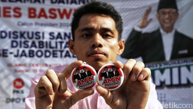 Seorang penyandang disabilitas menunjukkan pin "AMIN Presidenku" di sela-sela acara diskusi yang berlangsung di Islamic Center Bekasi, Jumat (15/12).