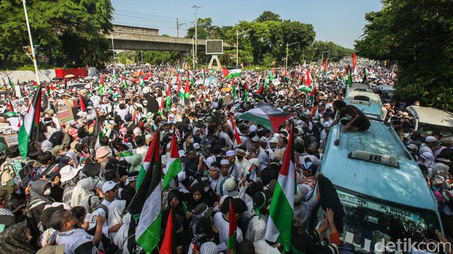 Jakarta - Massa menggelar aksi bela Palestina di depan Kedubes AS, Jakarta. Massa tampak memenuhi jalanan hingga Gambir.