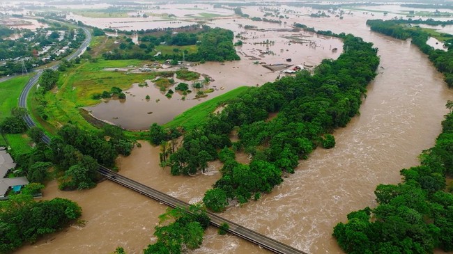 Hujan deras membuat Sungai Barron di Cairns meluap. Luapan air membanjir permukiman hingga lahan pertaninan di kanan kiri sungai.