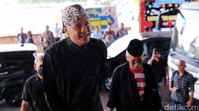 Yogyakarta - Capres nomor urut 3 Ganjar Pranowo menghadiri dies natalis ke-74 Universitas Gadjah Mada (UGM), Selasa (19/12). Ganjar hadir dengan mengenakan baju adat Jawa.