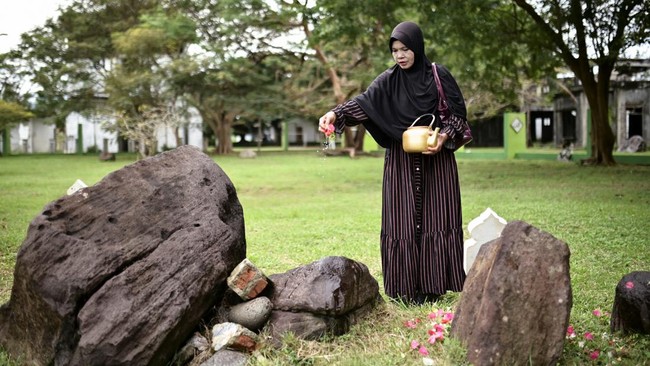 Seorang warga melakukan tabur bunga di kuburan massal korban tsunami pada peringatan 19 tahun Tsunami Aceh di Banda Aceh, Selasa (26/12/2023). REUTERS/Riska Munawarah