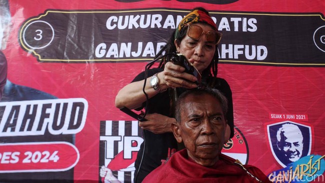 Jakarta - TPD Ganjar-Mahfud menggelar cukur rambut gratis bagi warga di kawasan Kramat, Jakarta. Selain dewasa, anak-anak juga dapat mengikuti cukur gratis ini.
