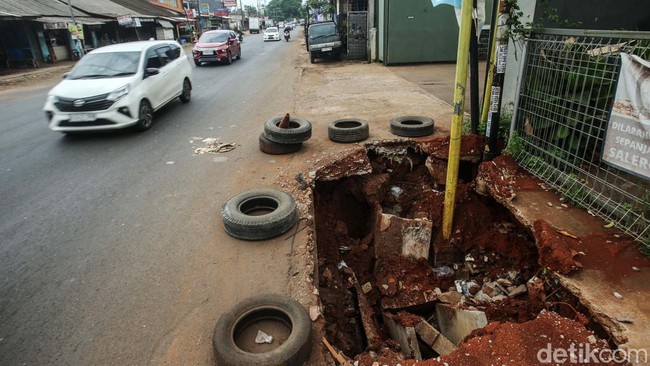 Bekasi - Hujan deras mengakibatkan longsor di Jalan Raya Narogong, Bantargebang, Bekasi. Longsor juga membuat trotoar berlubang.