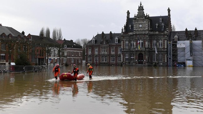 Prancis - Hujan lebat membuat wilayah Arques, Prancis, terendam banjir. Tim penyelamat dikerahkan untuk mengevakuasi warga yang terjebak banjir.