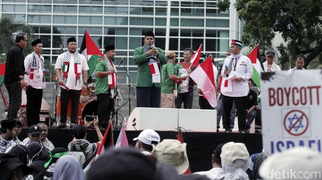 Jakarta - Sekitar dua juta orang berunjukrasa di depan Kedubes AS, Monas, hingga Bundaran Hotel Indonesia. Mereka menuntut penghentian genosida di Jalur Gaza, Palestina.
