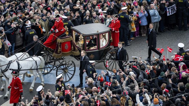 Raja Denmark Frederik X dan istrinya Ratu Mary menaiki kereta kembali ke Istana Amalienborg di Kopenhagen, Denmark, Minggu, 14 Januari 2024. Ratu Margrethe II menjadi raja pertama Denmark yang turun tahta dalam hampir 900 tahun ketika dia menyerahkan takhta kepada putranya yang telah menjadi Raja Frederik X. AP/Ida Marie Odgaard