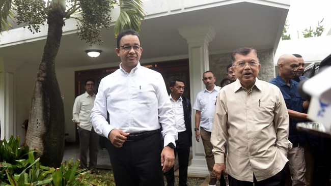 Calon presiden nomor urut 1 Anies Baswedan (kiri) bersama Wakil Presiden ke-10 dan ke-12 Jusuf Kalla (kanan) berangkat menuju lokasi kampanye di Makassar, Sulawesi Selatan, Rabu (17/1/2024).