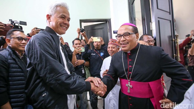 NTT - Calon presiden nomor urut 3 Ganjar Pranowo bertemu dengan Uskup Ruteng Mgr Siprianus Hormat di Keuskupan Agung Ruteng saat berkunjung ke NTT.