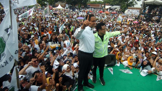 Tegal - Capres-cawapres nomor urut 1, Anies-Cak Imin menggelar kampanye di Slawi, Kabupaten Tegal. Anies mengatakan Tegal merupakan tempat kelahiran neneknya.
