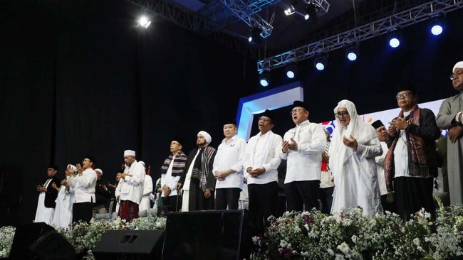 Ketua Umum Partai Perindo Hary Tanoesoedibjo, Habib Syech Bin Abdul Qodir Assegaf dan Menteri Kordinator Politik, Hukum dan Keamanan (Menko Polhukam) Mahfud Md menghadiri Sholawat Persatuan Indonesia Partai Perindo di Lapangan Panahan Pakansari, Bogor, Jawa Barat, Senin (29/1/2024) malam.
