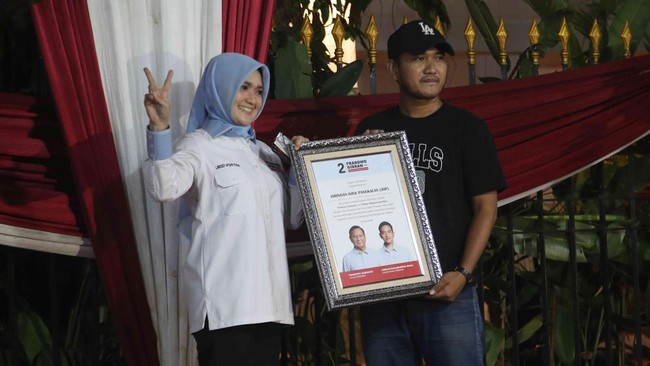 Wakil sekretaris TKN Lindsey Afsari Putri menerima deklarasi dukungan dari relawan Jaringan Ojek Pangkalan di Kertanegara, Jakarta Selatan, Selasa (30/1/2024).