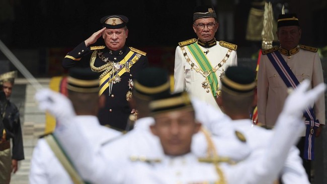 Sultan Ibrahim Sultan Iskandar (kiri) memberi hormat kepada pengawal kehormatan didampingi Perdana Menteri Malaysia Anwar Ibrahim di Istana Nasional di Kuala Lumpur, Malaysia Rabu (31/1/2024). AP/Hasnoor Hussain