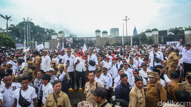 Demo massa Asosiasi Pemerintah Desa Seluruh Indonesia (Apdesi) di depan gedung DPR RI, Jalan Gatot Subroto, memanas siang ini.