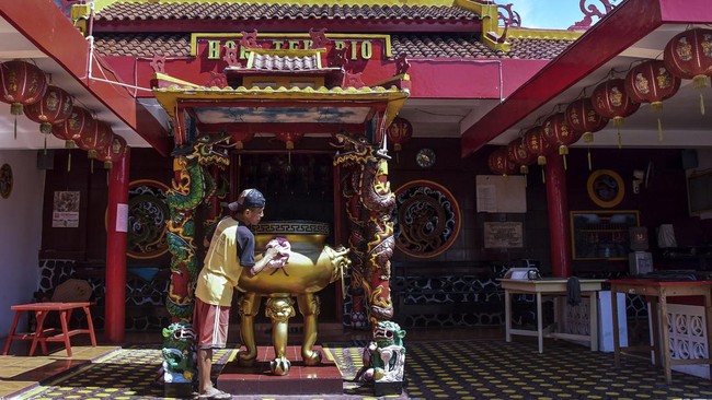 Pengurus klenteng melakukan berbagai persiapan untuk menyambut Imlek di Vihara Hok Tek Bio di Kabupaten Ciamis, Jawa Barat, Kamis (1/2/2024).