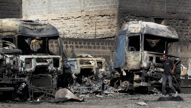Seorang pria berjalan melewati truk yang terbakar setelah ledakan di depot pengisian ulang tabung gas darurat di perkebunan Mradi, distrik Embakasi, di Nairobi, Kenya, 2 Februari 2024.