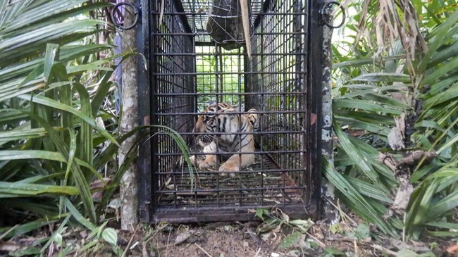 Aceh - Seekor harimau Sumatera masuk perangkap di desa Lawe Buluh Didi, kecamatan Kluet Timur, Kabupaten Aceh Selatan, Aceh. Harimau tersebut langsung dievakuasi.