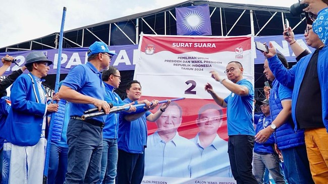 Bogor - PAN membirukan Kota Bogor dengan menggelar kampanye akbar. Ketum PAN Zulkifli Hasan dan Menteri BUMN Erick Thohir mensimulasikan pencoblosan jelang Pemilu 2024.