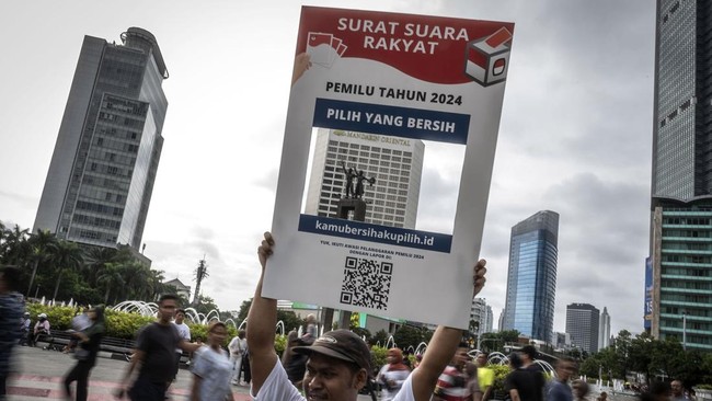 Jakarta - Massa Transparency International Indonesia menggelar aksi di Bundaran HI, Jakarta. Aksi itu untuk mengajak masyarkat memilih peserta Pemilu 2024 yang bersih.