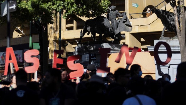 Surat-surat bertuliskan Asesino "Pembunuh" terpampang saat protes menentang kembalinya adu banteng, di luar arena adu banteng Plaza de Toros Mexico di Mexico City, Meksiko, Minggu (4/2/2024).
