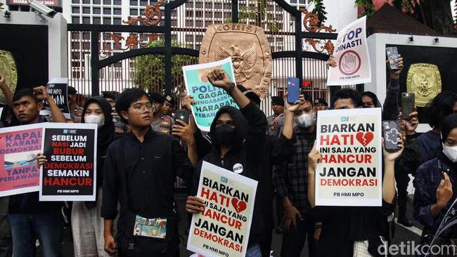 Jakarta - Mahasiswa dari HMI MPO melakukan aksi di depan Gedung KPU, Jakarta, Jumat (9/2/2024). Mereka meminta KPU bersikap netral pada Pemilu 2024.