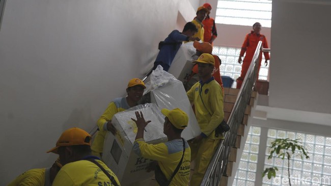 Jakarta - Petugas PPSU diperbantukan mengangkut logistik pemilu ke dalam kendaraan. Logistik tersebut selanjutnya didistribusikan ke TPS di Kecamatan Johar Baru, Jakpus.