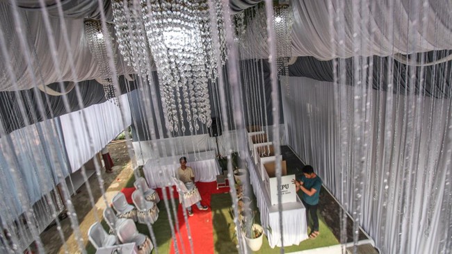 Cibinong - Tempat Pemungutan Suara (TPS) unik hadir ini Kampung Tengah, Cibinong, Kabupaten Bogor. TPS ini bertema nyoblos di hajatan pernikahan.