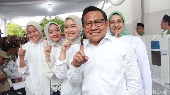 Jakarta - Cawapres Muhaimin Iskandar mencoblos di TPS 023, Kemang, Jakarta Selatan, Rabu (14/2/2024). Cak Imin memberikan hak suaranya bersama istri dan anak-anak.