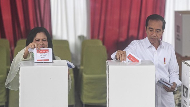 Jakarta - Presiden Joko Widodo melakukan pencoblosan Pemilu 2024 di TPS 10 Gambir, Jakarta, Rabu (14/2). Begini momennya.