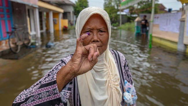 Warga menunjukkan jari kelingking bertinta setelah menggunakan hak pilihnya pada Pemilu 2024 di Tempat Pemungutan Suara (TPS) 02 yang terendam banjir di Desa Ngelowetan, Kecamatan Mijen, Kabupaten Demak, Jawa Tengah, Rabu (14/2/2024).