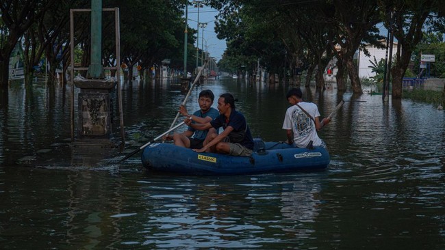 Warga menaiki perahu karet untuk menembus banjir yang mulai surut di jalur pantura Demak-Kudus, Kecamatan Karanganyar, Kabupaten Demak, Jawa Tengah, Rabu (14/2/2024).
