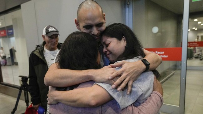 Sean Ours, tengah, yang tinggal di Alexandria, VA, dan Emily Reid, kanan yang tinggal di Raleigh, NC, memeluk untuk pertama kalinya ibu kandung mereka Sara Melgarejo setibanya di bandara di Santiago, Chile, Minggu (18/2/2024).