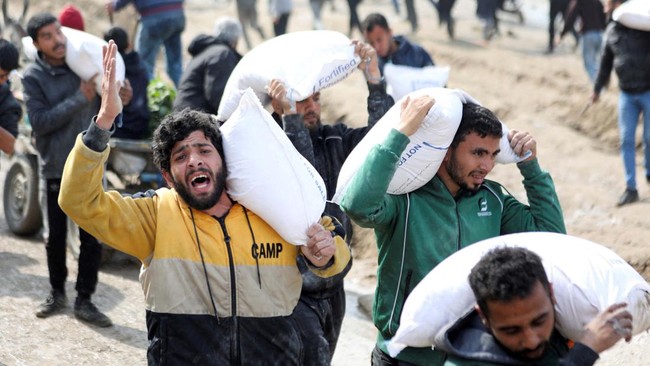 Gaza - Warga Gaza mengalami krisis kelaparan akibat serangan Israel. Mereka mengambil tepung dari truk bantuan yang datang.