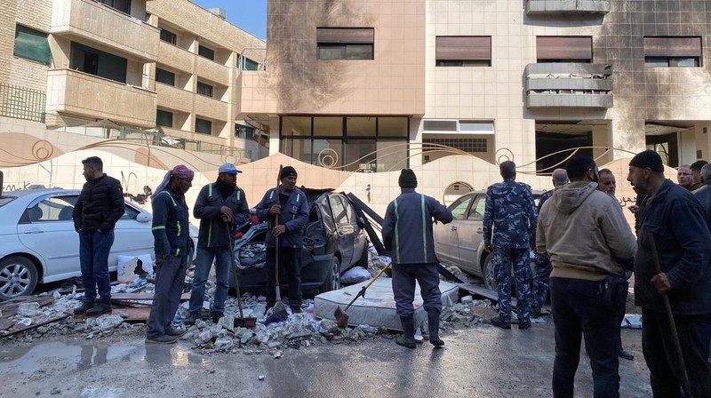 Pekerja dan orang-orang berdiri di dekat bangunan yang rusak setelah, menurut laporan media pemerintah Suriah, beberapa rudal Israel menghantam sebuah bangunan tempat tinggal di distrik Kafr Sousa, Damaskus, Suriah 21 Februari 2024.