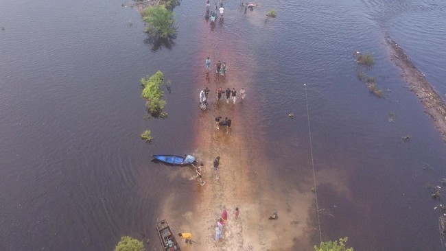 Jambi - Banjir di Gunung Mas, Tanjung Jabung Barat, Jambi, jadi wisata dadakan. Seperti terlihat pada Jumat (23/2/2024) kemarin.
