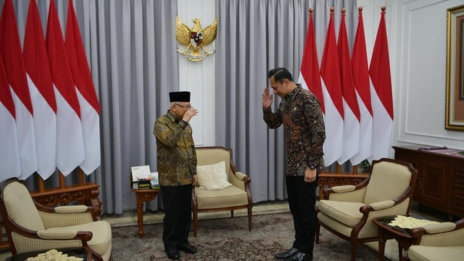 Jakarta - Menteri ATR/BPN Agus Harimurti Yudhoyono (AHY) menyambangi Wapres Ma'ruf Amin di Menteng, Jakpus. AHY dan Ma'ruf Amin terlihat saling melempar hormat.