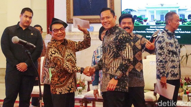 Jakarta - Menteri ATR/BPN Agus Harimurti Yudhoyono menghadiri sidang kabinet perdana di Istana. Sebelum rapat, AHY sempat bersalaman dengan KSP Moeldoko dan menteri KIM.