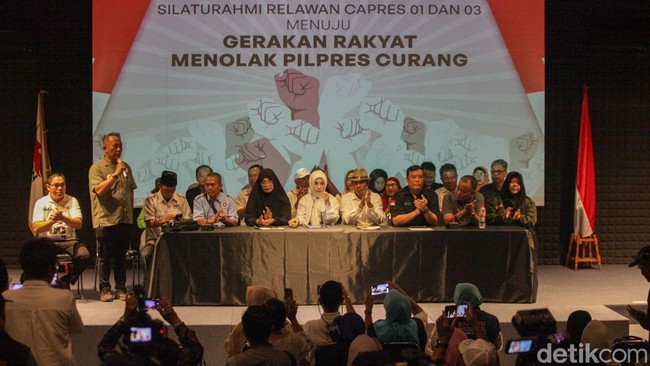 Jakarta - Relawan capres nomor urut 1 dan 3, Anies Baswedan dan Ganjar Pranowo berkumpul. Mereka menolak dugaan kecurangan di Pemilu 2024 dan mendorong hak angket di DPR.