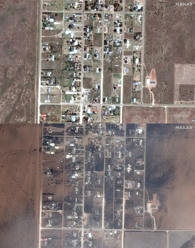 Texas - Satelit menangkap penampakan sebelum dan saat kebakaran hutan di Smokehouse Creek di Fritch, Texas. Negara bagian itu pun telah mengeluarkan deklarasi bencana.