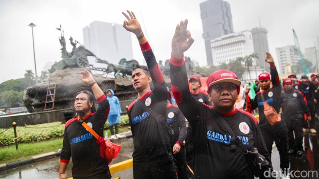 Aksi Massa Buruh Demo Hujan-hujanan di Patung Kuda