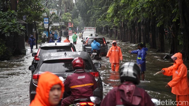 Jakarta - Petugas PPSU dan SDA membantu mengurai macet saat banjir merendam kawasan Kelapa Gading, Jakarta Utara. Begini aksinya.