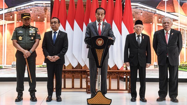 Presiden Joko Widodo (tengah) didampingi Wakil Presiden Ma'ruf Amin (kedua kanan), Mensesneg Pratikno (kedua kiri), Panglima TNI Jenderal Agus Subiyanto (kiri) dan Menteri PUPR Basuki Hadimuljono (kanan) memberikan keterangan pers sebelum berangkat ke Australia dalam rangka menghadiri KTT ASEAN-Australia di Base Ops Lanud Halim Perdanakusuma, Jakarta, Senin (4/3/2024).