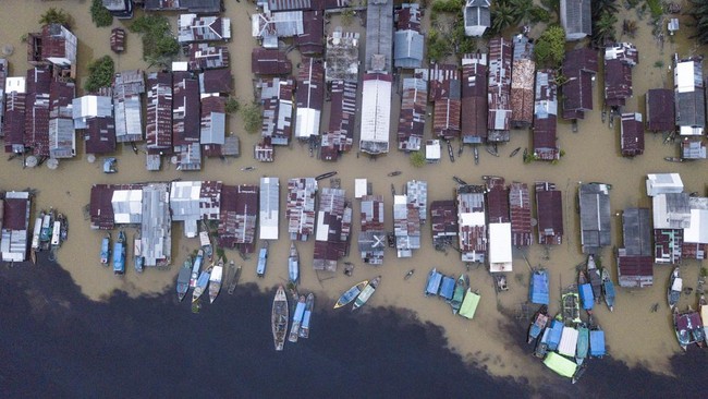 Foto udara kawasan permukiman yang terendam banjir di tepi Sungai Kumpeh, Suak Kandis, Muaro Jambi, Jambi, Selasa (5/3/2024).