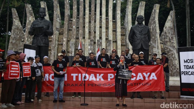 Jakarta - Sejumlah warga yang tergabung dalam Masyarakat Penegak Konstitusi menggelar aksi mosi tidak percaya di Tugu Proklamasi, Jakarta.
