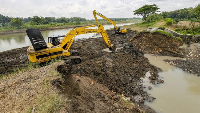 Pekerja mengoperasikan alat berat memperbaiki tanggul waduk yang jebol di Padangan, Bojonegoro, Jawa Timur, Kamis (7/3/2024).