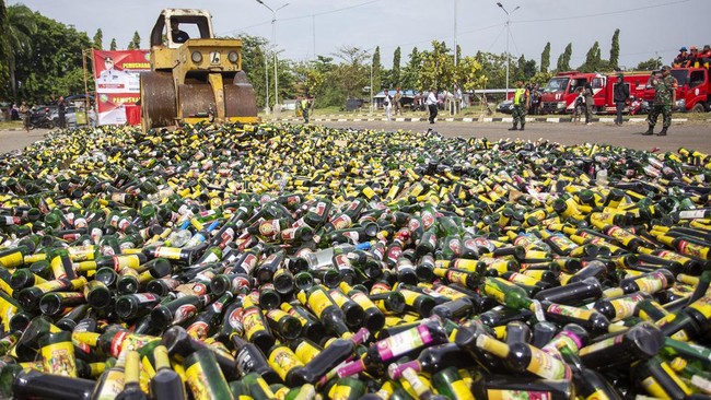 Indramayu - Satpol PP Kabupaten Indramayu melakukan pemusnahan minuman keras hasil sitaan, Jumat (8/3/2024). Miras dimusnahkan dengan cara digilas alat berat.