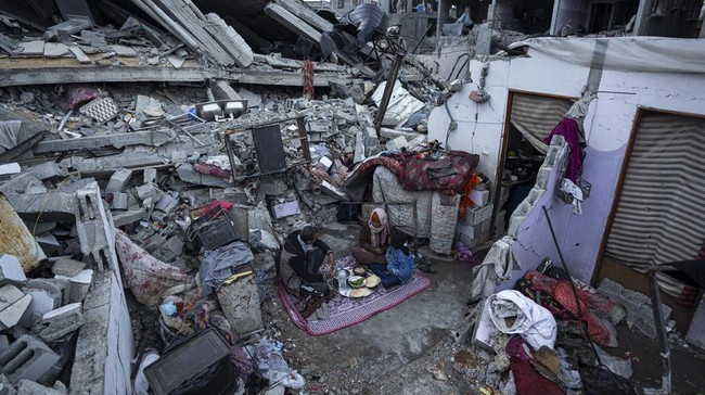Gaza - Sebuah keluarga memasak dan berbuka puasa di rumahnya yang hancur. Keluarga itu menyantap menu buka puasa mereka di tengah puing-puing rumah.