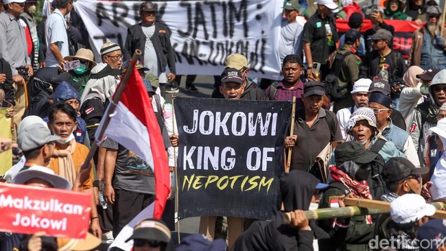Jakarta - Massa demo memadati di depan gedung DPR, Jakarta, Selasa (19/3/2024). Massa demo datang bergerombol mengenakan atribut dan membawa spanduk.